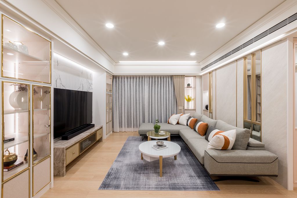 在郁琇琇設計師的作品中,常見私人訂製圖騰的應用,反映量身打造的尊榮規格。本案也不例外,接續所處建案略帶奢華的宮廷風格,於玄關地坪取材瑰麗考究的紋理鋪就。此外,醒目的成排美式櫃體,其每扇門片後隱逸的機能不盡相同,例如靠近玄關的消毒櫃,配備紫外線燈 與循環扇;鞋櫃搭載旋轉層架和通風扇,變幻激效收納。緊接著,延伸到電視櫃兩側的展示櫃,充盈時髦細緻的氣氛;電視牆別出心裁的拼花石紋,令美式優雅的情境敘事詮釋得淋漓盡致。沙發背牆則因毗鄰書房,隔間的材質結構採取局部穿透,男主人可在不被打擾的情況下,靜心凝視家人間的互動,一舉數得。