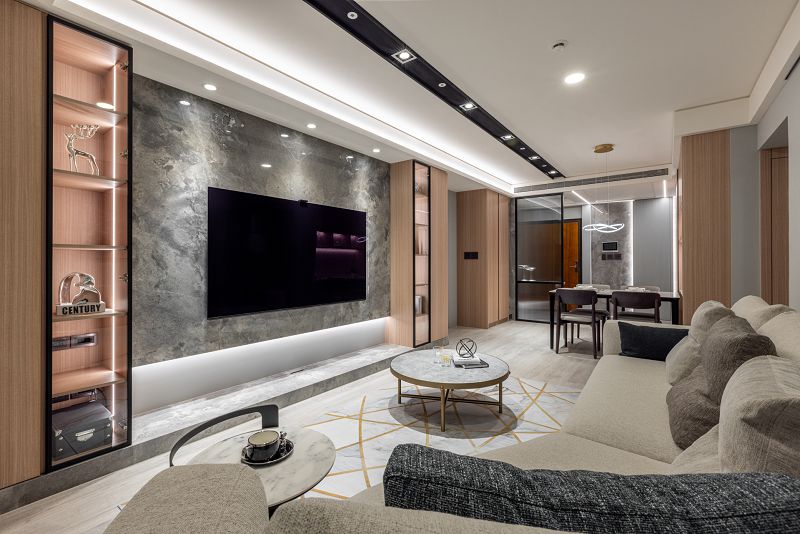 玄關延續全域灰色、原木主調,揉入黛黑六角磚地坪的獨特石材肌理,呼應起居中心名為米蘭時尚的灰色大理岩,於一片灰白主視覺隱匿多元質感、豐厚層次,巧借廣袤光譜的疊砌,表述魅力況味;電視牆更輔以主臥隱藏門位移作幅寬延伸,展現軒昂氣宇;挾帶金色元素的傢具傢飾、軟裝配件則彰顯屋主獨到的層峰生活品味。總體而言,公領域各隅的尺度比例拿捏恰到好處,造就流暢有致的動線與開闊空間感。此外,美曲板線條佐油性漆噴塗的應用堪稱點睛之筆,同步美化電箱和廚房防火門,並適時揉入溫潤木質調,演繹別緻低奢氛圍。