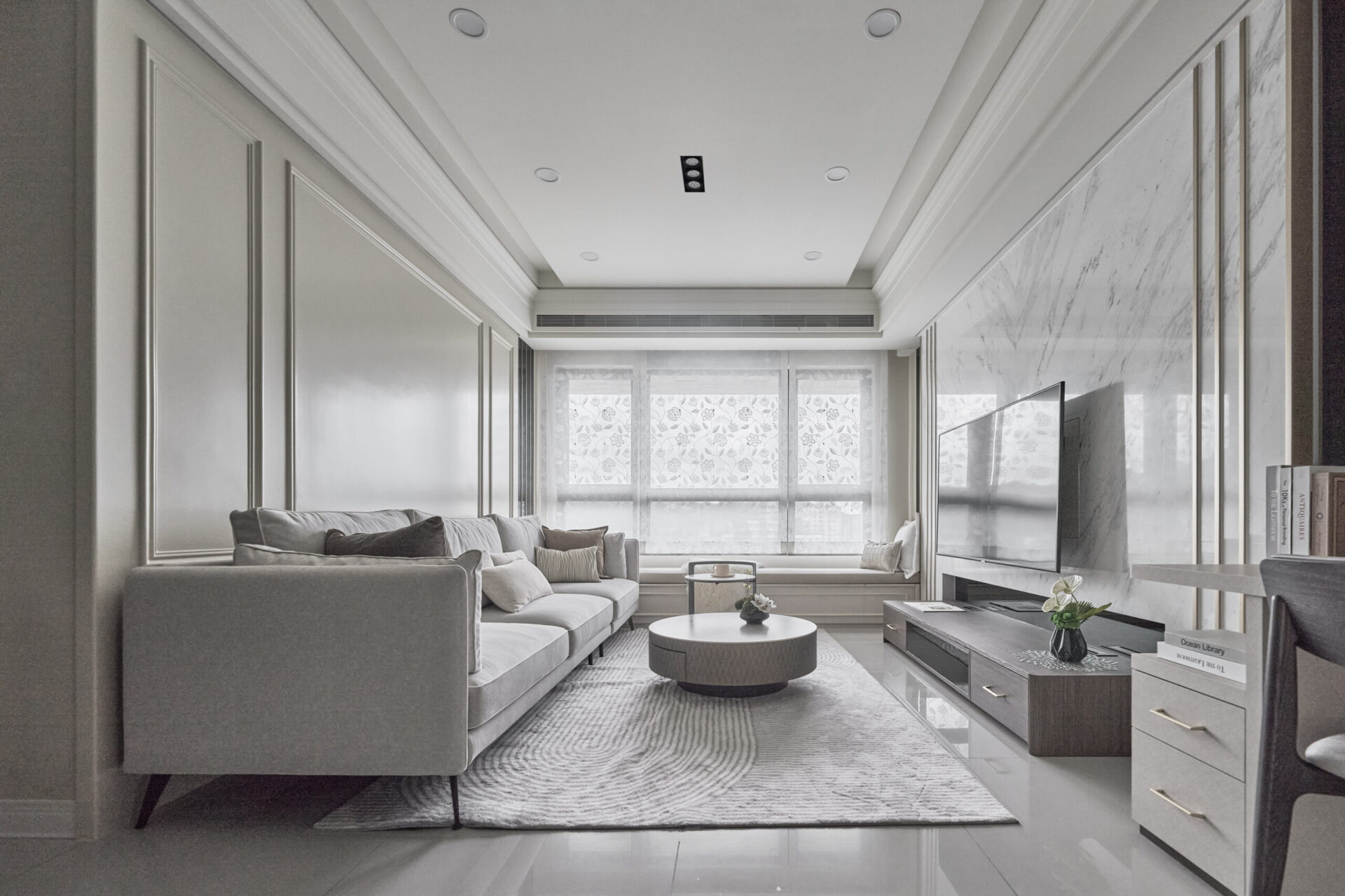 緊接著,持續向前挺進,登場的是深灰石材紋理暈染的質感端景牆,以及屏風、矮櫃搭築之端景櫃;其側邊巧借茶鏡銜接,增添華麗亦有感官放大的效果,進而串聯雙面櫃與閱讀區,無論行李箱或掃地機器人等物件都能完美儲放。電視主牆取材色澤均衡、肌理細緻的超級銀狐大理石,大器的V字形拼貼和兩側金色線條分割造型交相輝映。
