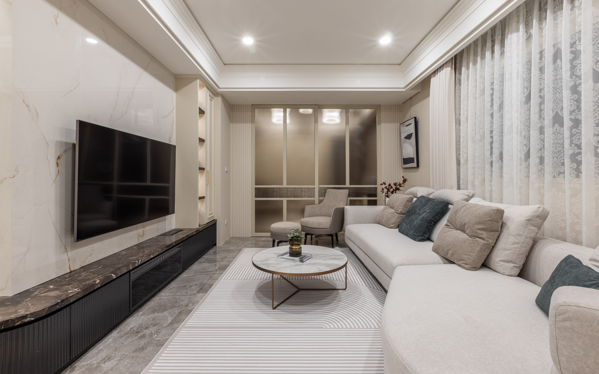 進門處藉由大門位置的挪移擘造獨立玄關,亦搭載絢麗屏風、藍白色石紋磚地坪作區隔,佐端景櫃圍塑落塵區,保全隱私與收納機能。全域採用柔婉、溫潤的淡雅色系暈染主視覺,演繹經典美式家居的敞朗大器,而地坪選擇簡練的灰色調亮面拋光石英磚,搭配局部白色大理石材,詮釋當代豪邸的氣宇軒昂。此外,電視牆矮櫃援引玄黑、深咖啡色鋪就檯面,整合美曲板、圓弧線條等語彙勾勒豐富表情,也有助於流暢格局動線。另一方面,善用屋宅本身良好的屋高條件,將櫃體盡量拉升至板材極限之240公分,在在營造寬敞開闊的感官。構造部分,巧借線板造型包覆修飾柱體,頗有歐洲建築的優雅韻味,一旁佇立具穿透視覺的端景櫃,描繪隱約、曖昧的過渡空間。