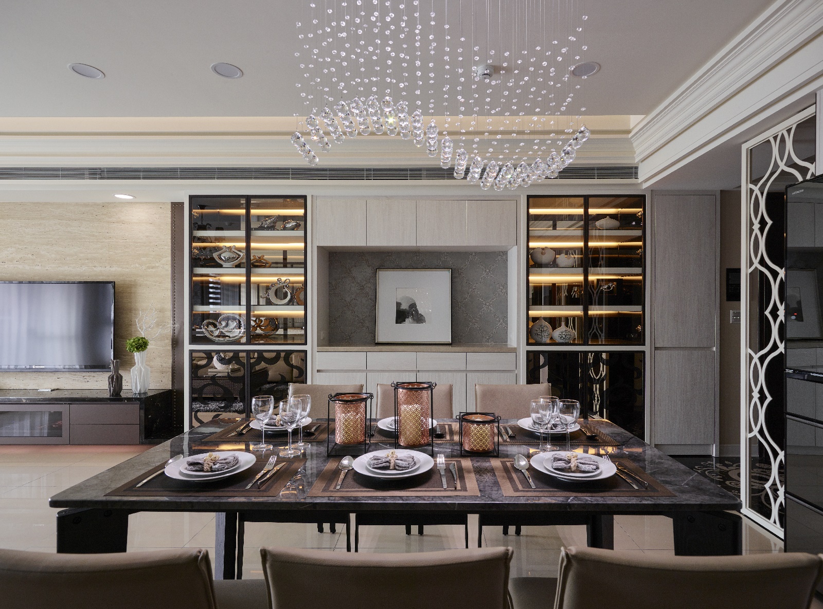 - 雕花點睛:屏風與門片以鍍鈦金屬勾勒雕花線條,使細節語彙於全室一致展開。