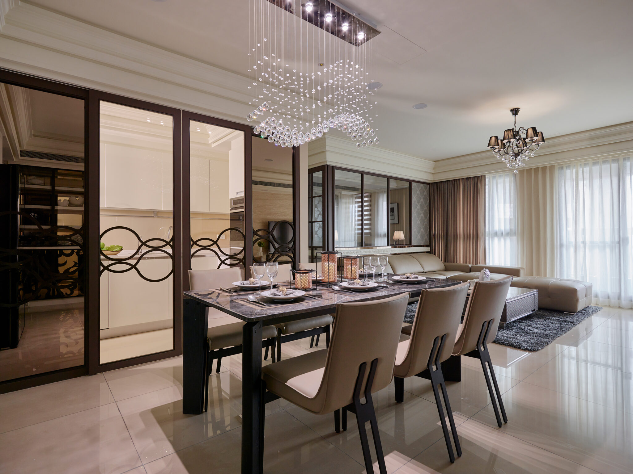- 鍍鈦雕花:全室屏風及門片皆以鍍鈦金屬勾勒雕花圖騰,形成一致的典雅視覺語彙。