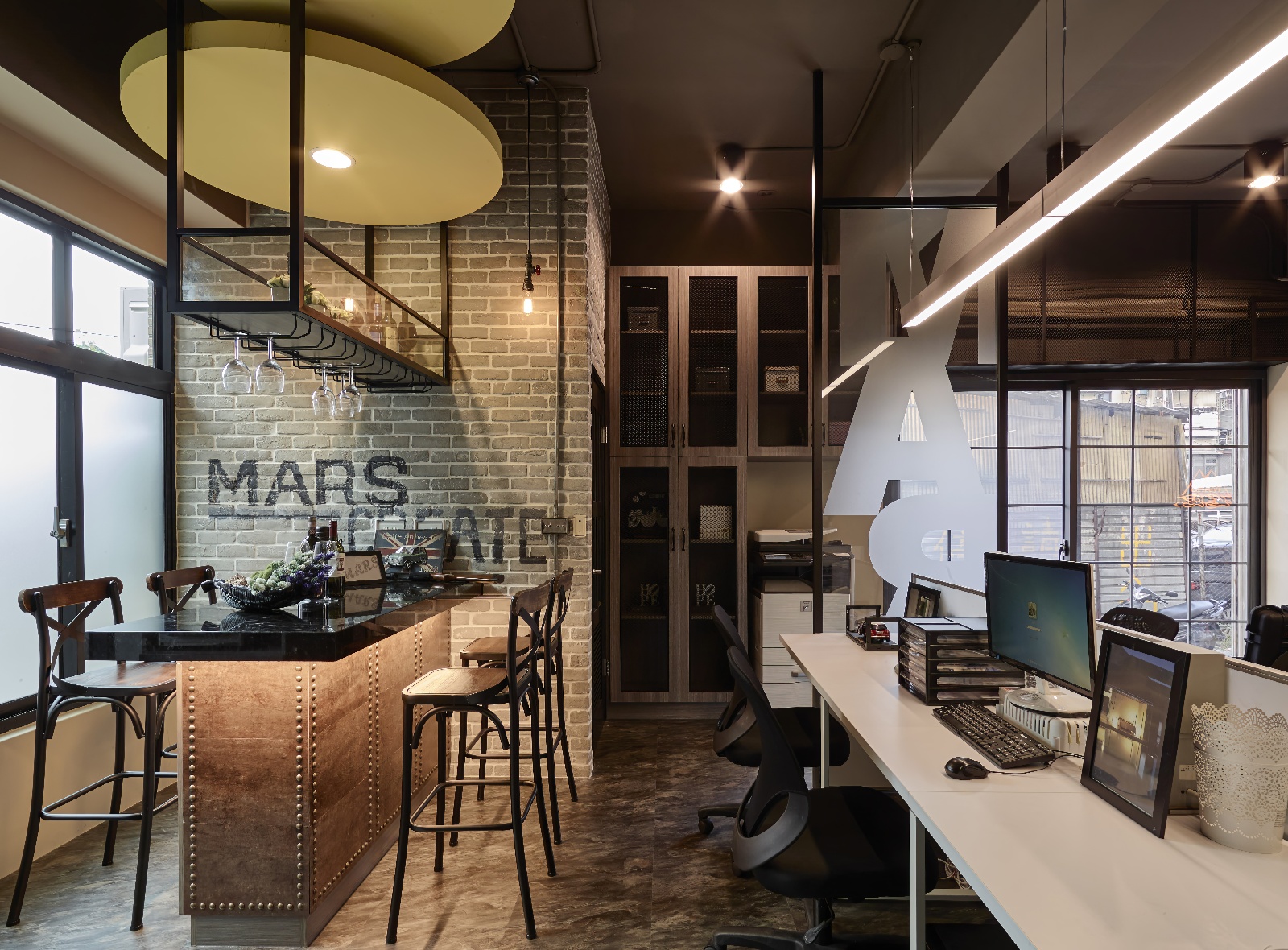 - 交流節點:吧台區以石質檯面構成,上方搭配鐵件形塑置物空間,打造愜意放鬆的靈感角落。