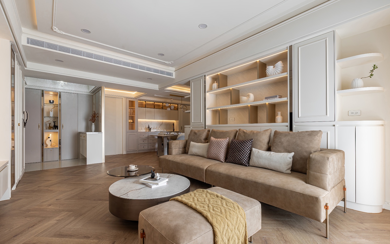 - 迎賓序章:玄關以端景屏風延展視覺層次,展示櫃與矮櫃共築優雅落塵區。