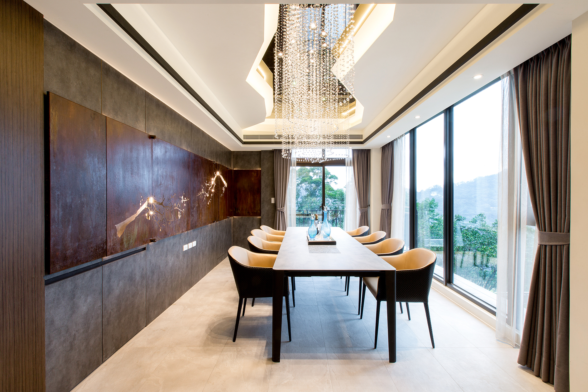 餐廳採用中島與大餐桌的設計,創造開闊流暢的動線,無論是日常用餐或親友聚會,都能輕鬆自在地享受共聚韶光。中島區域結合備餐、展示與輕食功能,不僅強化餐廚一體的實用性能,也讓烹飪過程與交流無縫銜接。餐區一側的開放式餐櫃巧妙整合收納與陳列,讓常用器皿、杯具及裝飾品有序擺放,提升使用便利性,為空間增添層次與生活感。