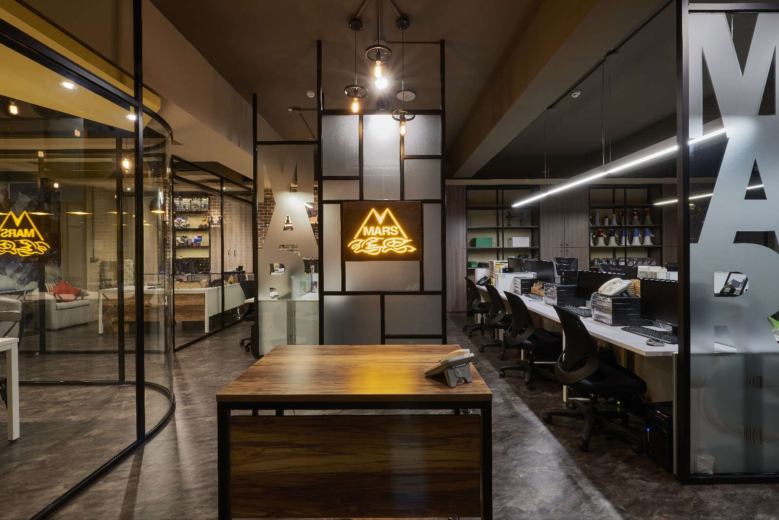 為了提升辦公區域的視覺通透性,我們大量在場域之間運用玻璃隔牆,使空間在保持區隔的同時,仍能保有視覺上的開闊感。將反差強烈的清玻璃與霧玻璃交錯運用,強化層次變化,同時讓不同區域間的關係更為靈活。Logo主題牆則依循蒙德里安式的黃金比例分割手法呈現,結合企業標誌「MARS」的字母,透過橘黃光影的綻放,展現品牌如火焰般的熱情與動能,成為辦公空間中的視覺焦點。