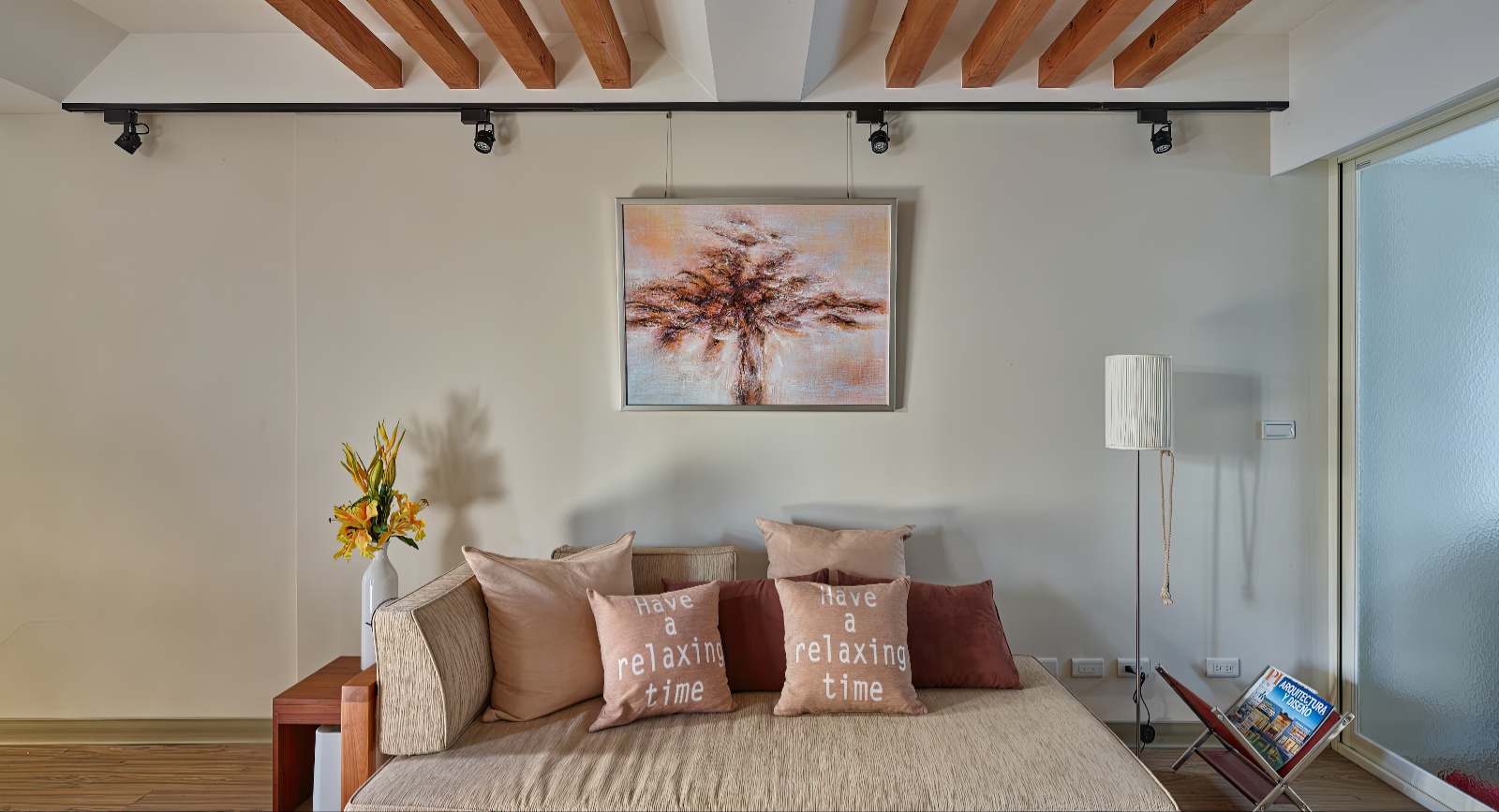 • 舒適座位:沙發、木桌及層架皆採暖木色鋪陳,創造輕鬆的聚會交流氛圍。